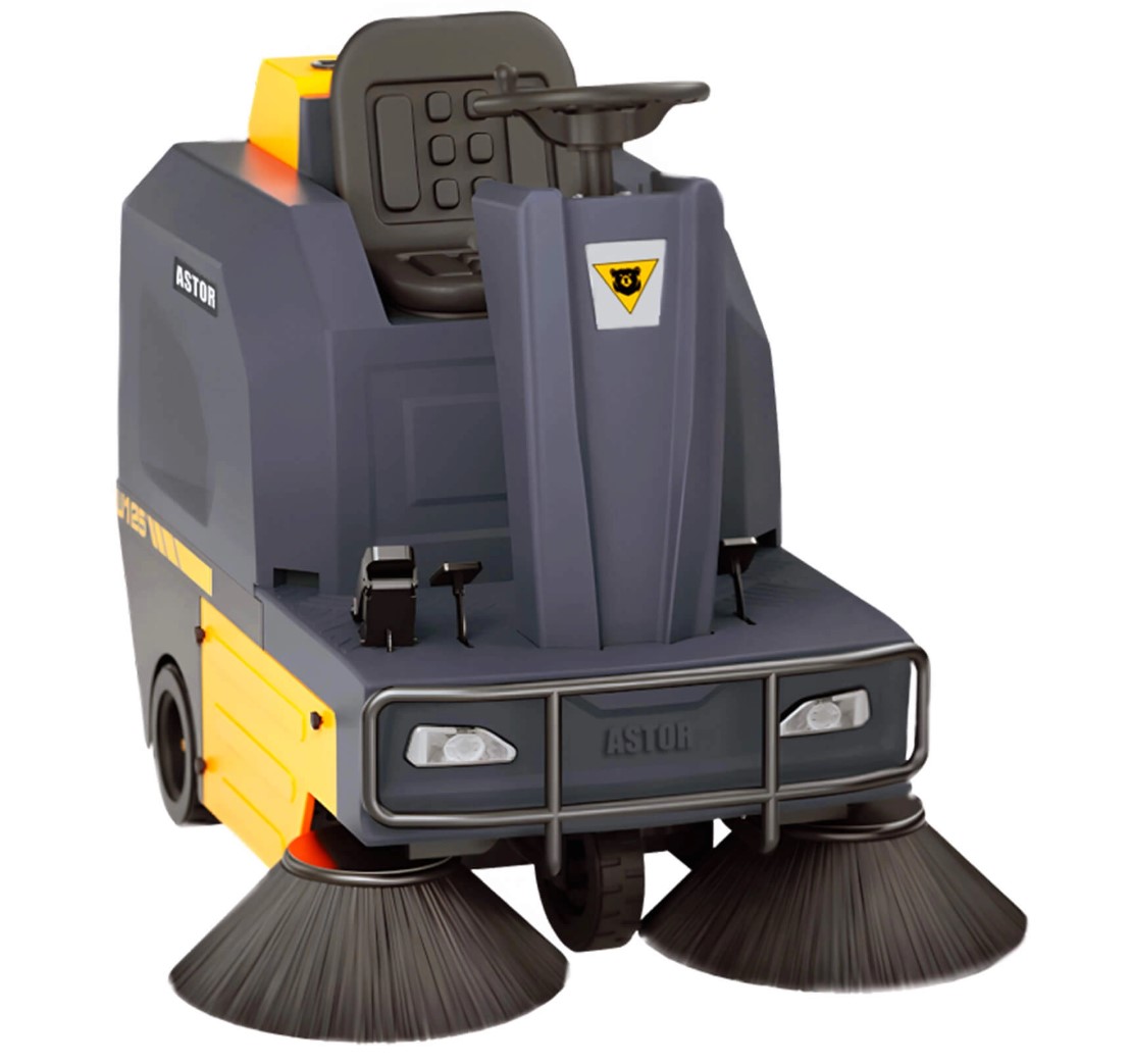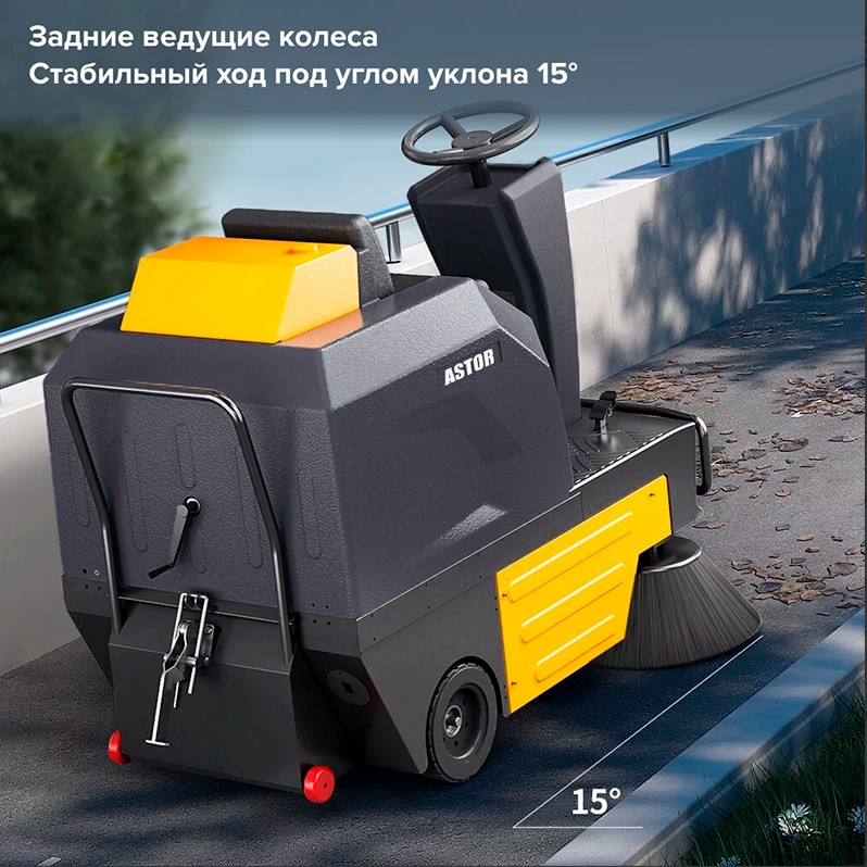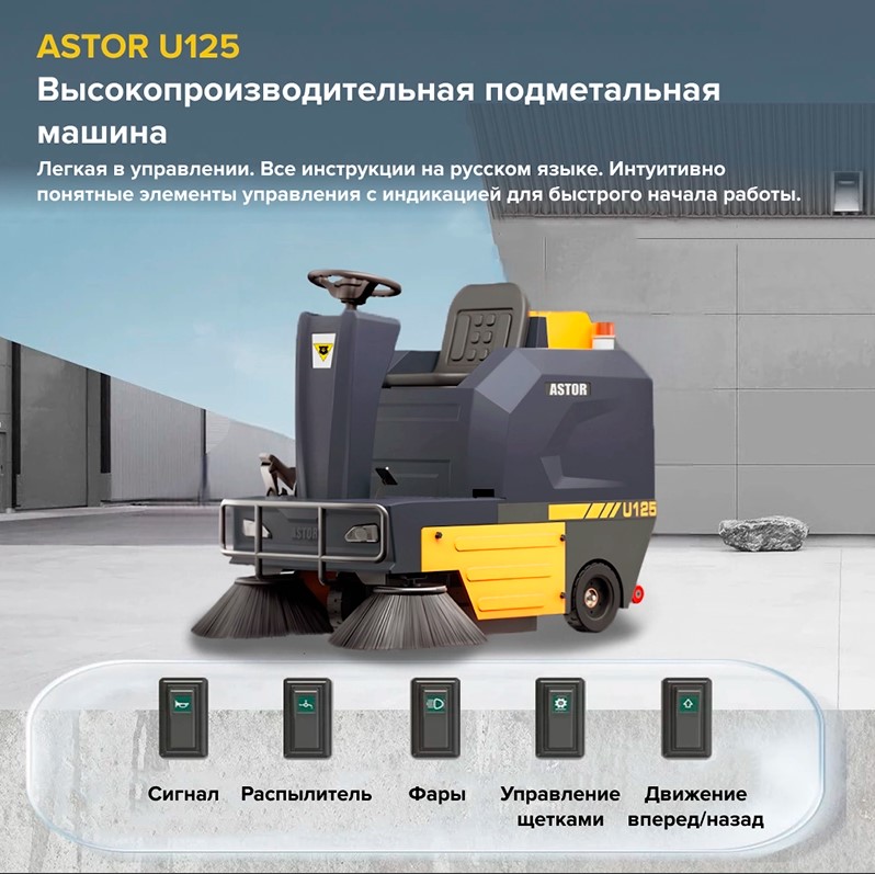 ASTOR U125 — это профессиональная подметальная машина с водителем, она имеет автоматическое управление и управление одной кнопкой,