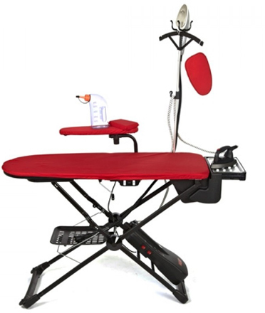 – эргономичная форма и удобное расположение парогенератора. В конструкции этой гладильной системы парогенератор имеет плоскую обтекаемую форму и расположен снизу на ее ножках, таким образом он не мешает при работе и не портит общий эстетичный вид системы. Объем бойлера парогенератора 1 л, мощность 1000 Вт;