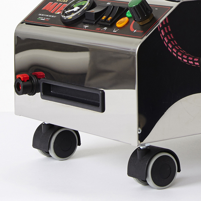 При желании парогенератор можно снять с подставки гладильной доски, присоединить к нему колесики, которые идут в комплекте гладильной системы, и использовать парогенератор автономно. Это очень удобно при отпаривании гардин или обивки мягкой мебели, а также при паровой чистке, которую можно производить парогенератором гладильной системы MIE Primo Luxe, используя для этого комплект паровых насадок LUXE.