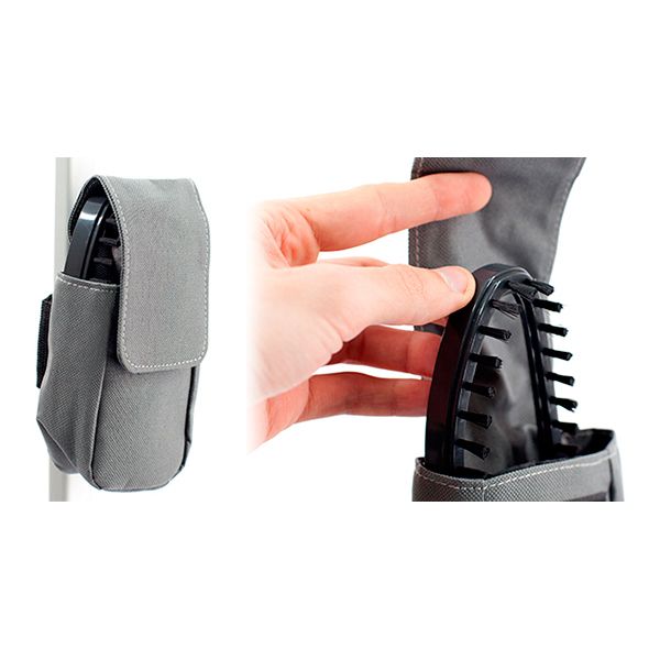 - Футляр для аксессуаров. Футляр прикрепляется к стойке отпаривателя, в него можно поместить дополнительные приспособления: две ворсистые щеточки с разной частотой ворса и зажим для стрелок на брюках. В этом футляре аксессуары будут всегда у Вас под рукой.