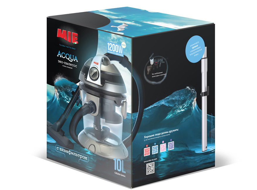 - Большим плюсом пылесоса с аквафильтром является сохранение показателя мощности всасывания на протяжении всей уборки (независимо от наполнения грязью резервуара), чего не скажешь о пылесосах с мешками для пыли. Благодаря высокой мощности двигателя (ном. 1000 Вт – 1200 Вт) и мощности всасывания (200 Вт) MIE Acqua поглощает пыль и грязь не только с поверхностей в доме, но и всасывает воздух, в котором тоже присутствует пыль и аллергены. Вся грязь остается внутри пылесоса, а обратно в помещение выходит уже очищенный и увлажненный воздух. После уборки эко-пылесосом с аквафильтром MIE Acqua в доме ощущается свежесть и становится легче дышать.